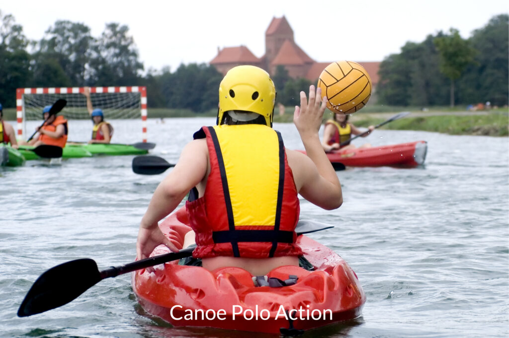 Canoe Polo is a team ball game similar to Water Polo, with the difference that players are in canoes. Players try to pass the ball to each other and score in a goal at the defending teams end while navigating around the pool by canoe.